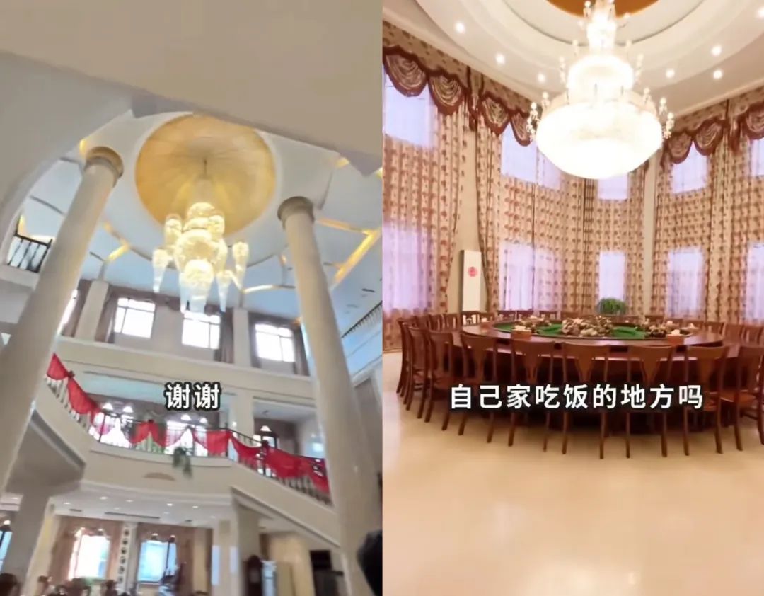 一进家门便是三层楼梯和水晶吊灯,年年有余的摆件是半吨重的,饭桌是可供二十人用餐的。