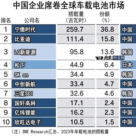 韩国调查公司SNE Research的数据显示,从2023年车载电池的全球份额(以搭载量为准)来看,中国宁德时代新能源科技(CATL)排在首位,第二位是比亚迪。前10家中有6家是中国企业,日本企业只有排名第4的松下控股。
