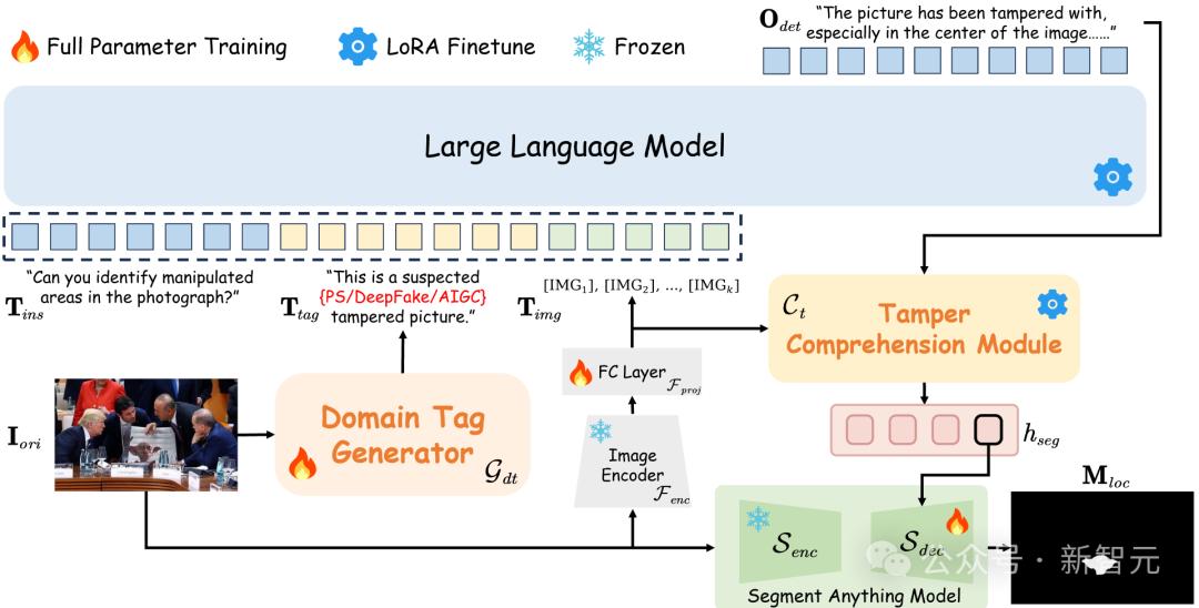 DTE-FDM负责图像伪造检测与检测结果分析,利用数据域标签(domain tag)弥合不同伪造类型数据之间的数据域冲突,引导多模态大语言模型生成检测结果及判定依据。MFLM则使用DTE-FDM输出的对于篡改区域的描述作为视觉分割模型的Prompt,引导其精确定位篡改区域。