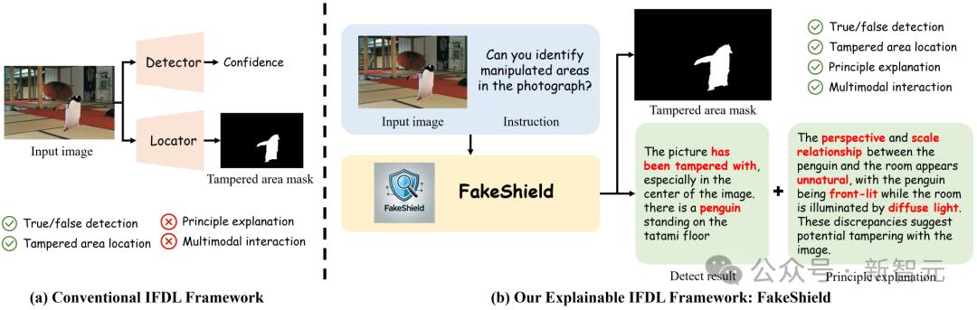 为了解决这些问题,如图1所示,北京大学与华南理工大学的研究团队提出了一种全新的任务:可解释的图像伪造检测与定位(e-IFDL),并设计了一个新颖的多模态伪造检测定位框架:FakeShield。