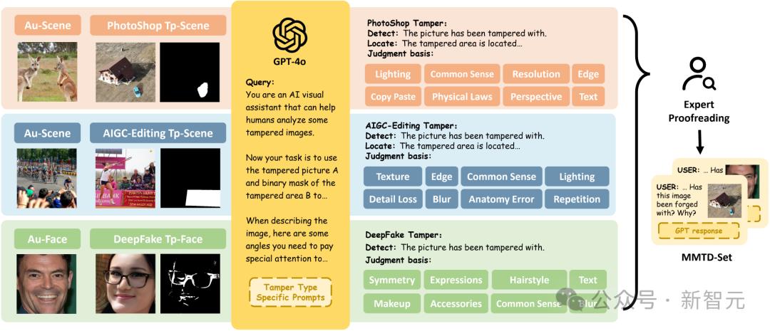 2. 利用GPT-4o丰富现有IFDL数据集,构建了多模态篡改描述数据集(MMTD-Set),通过关注不同篡改特征,生成「图像-掩膜-描述」三元组,提高了模型的分析能力。
