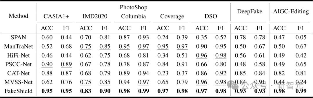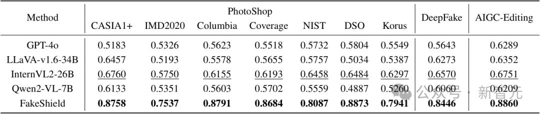 这一比较覆盖了Photoshop、DeepFake以及AIGC编辑等多种篡改场景,全面评估了各模型在多模态信息融合和复杂篡改检测中的表现。