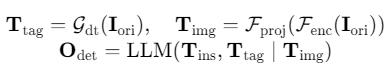 这些图像特征与指令文本T_ins一并输入LLM,生成检测结果O_det,包括是否篡改、具体的篡改区域描述以及解释性分析。