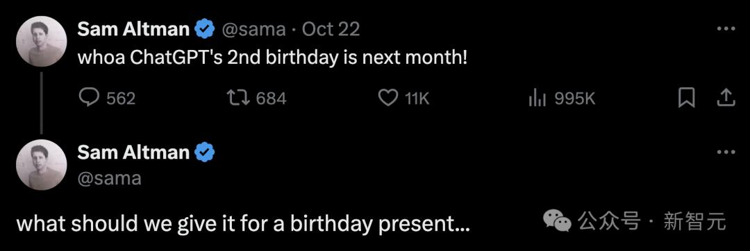 还记得几天前,Sam Altman突然冒泡,「下个月是ChatGPT的第二个生日,我们应该送它什么生日礼物呢」?