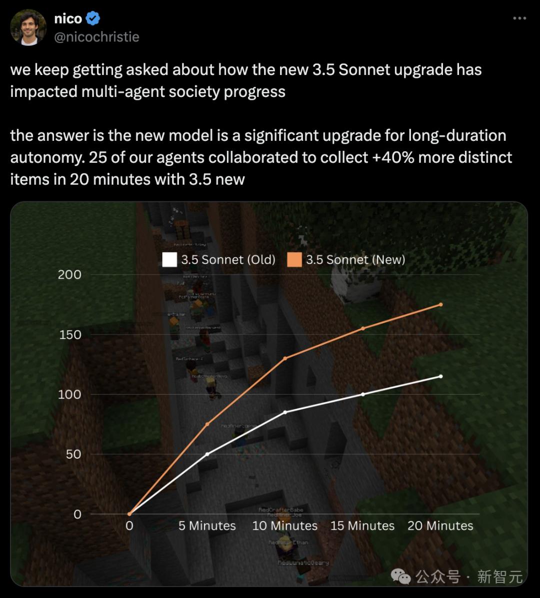 智能体研究初创公司Altera Al给出了答案,新模型是对长时间自主性的最大升级。我们的25个智能体在「我的世界」中合作,在20分钟内收集了超过40%的不同物品。