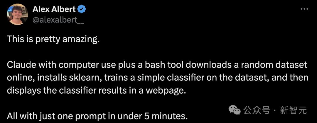 他先用Claude计算机和bash工具,在线下载一个随机数据集,然后安装sklearn,在数据集上训练一个简单的分类器。