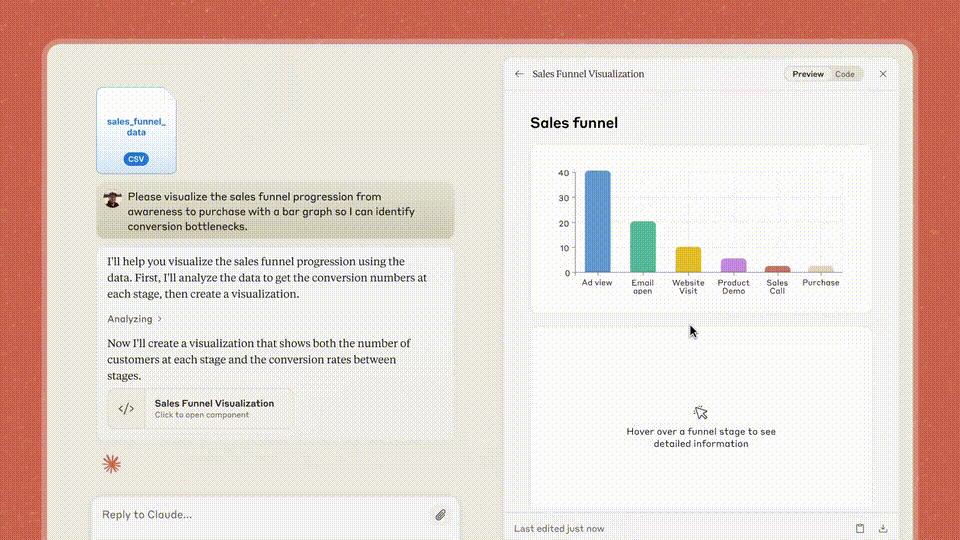 假设让Claude绘制销售渠道进展的直观图,它能自主分析数据写代码,并给出要求的可视化图。