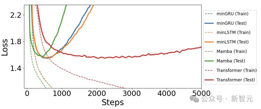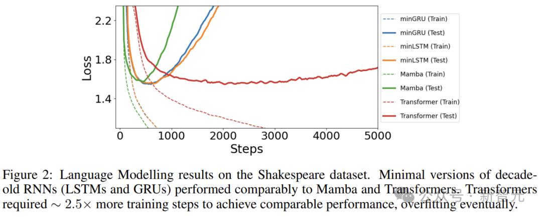Mamba的表现略差于其他模型,但训练速度更快(400步),minGRU和minLSTM分别花费575步和625步。而Transformer直接比minGRU多了2000 步,慢了大概2.5倍。