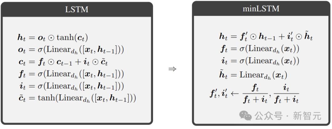 研究人员对传统的两种RNN架构LSTM和GRU,进行了大刀阔斧的改造,从中诞生了两个新模型:minLSTM和minGRU。