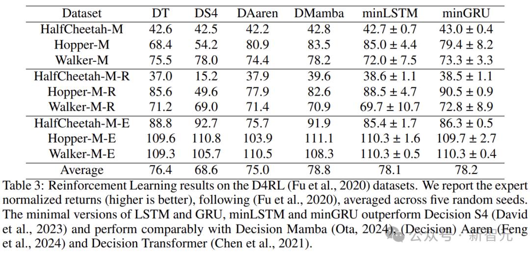 上表将minLSTM和minGRU与各种决策模型进行了比较,包括原始的Decision Transformer(DT)、Decision S4 (DS4) 、Decision Mamba和Aaren。