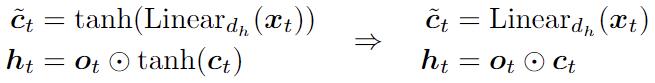 三个门控(input gate、output gate、forget gate)和输入的分量,都通过线性投影和非线性激活函数来得出,并且依赖于上一个时刻的隐藏状态ht-1。