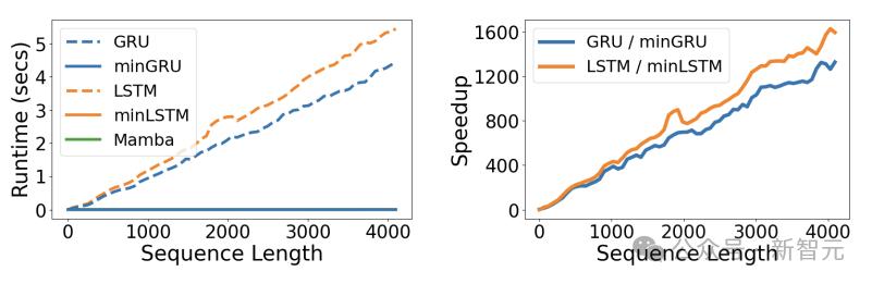 在运行时间方面,minLSTM、minGRU与Mamba实现了类似的效率。