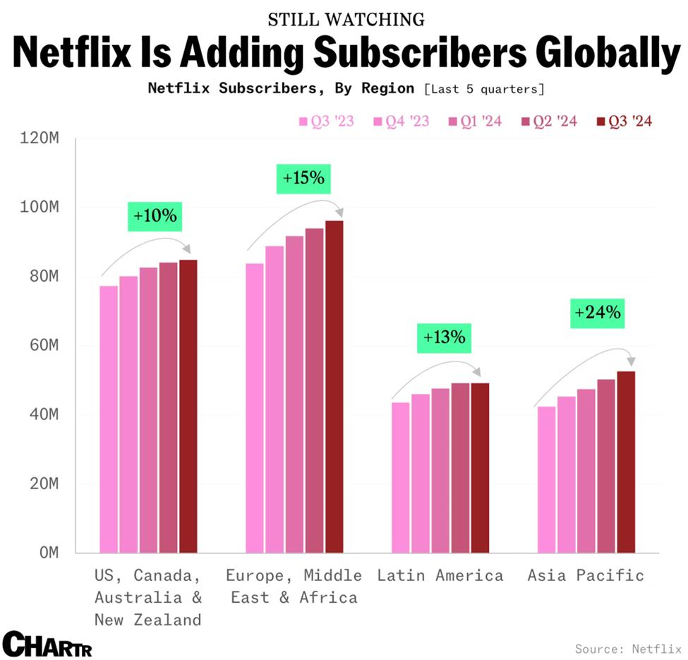 图中可以看到,在全球各个区域,Netflix 的付费订阅用户年增长(YoY)达到了两位数的比率。