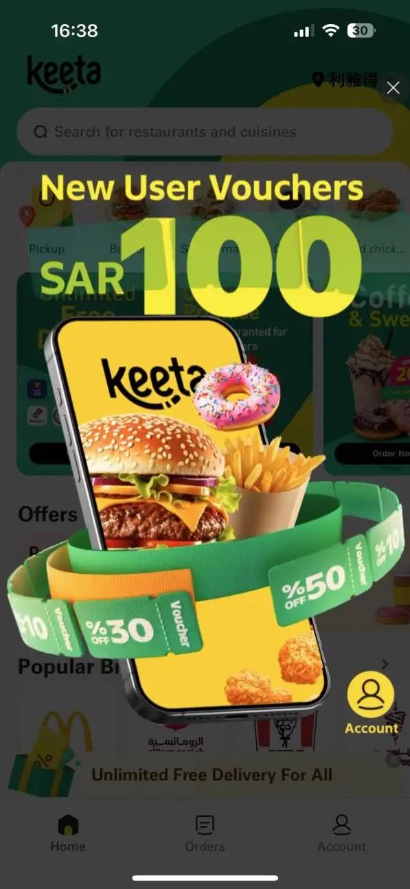 在用户端,是屡试不爽的「烧钱换市场」。点开 Keeta 沙特版的页面,100 里亚尔(约189 人民币)的消费券映入眼帘。而更诱人的是配送费的免除,据了解,沙特外卖的平均配送费用在 15 里亚尔上下,折合人民币接近 30 元。