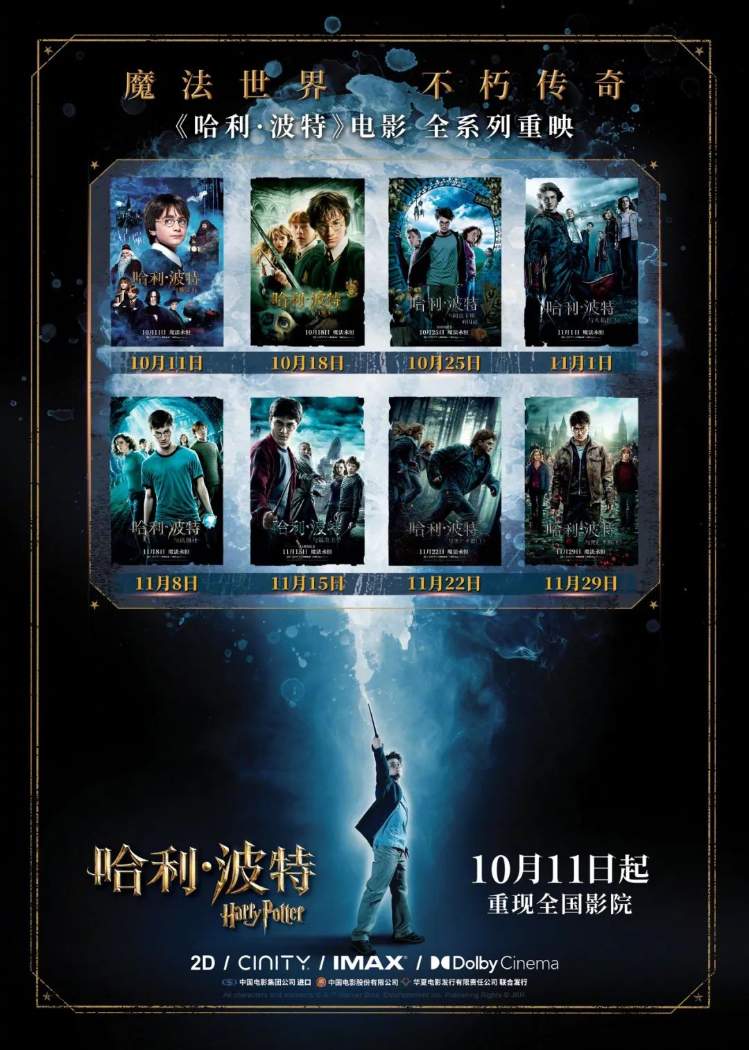10月登陆院线的“哈利.波特”系列电影更不必说。虽然这一经典IP曾在诸多影展、电影节有过小规模重映,但市场需求依然存在,时隔多年仍能一呼百应。从当前的票房情况来看,本次重映的“哈利·波特”八部曲有望取得4至5亿元量级的总票房,为国庆档后的10月大盘增添一抹亮色。