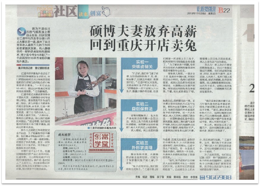 至于我怎么做到这个产业的呢,背后有非常漫长的创业的故事。从北京做软件到返乡做到食品行业,其实是一拍脑瓜有点冲动的,所以最开头选择的方向(手撕兔)可能也是有点问题。这是当年《重庆晚报》的报道,照片上这位也是我的“灵魂伴侣”——江道平博士,她也在现场。
