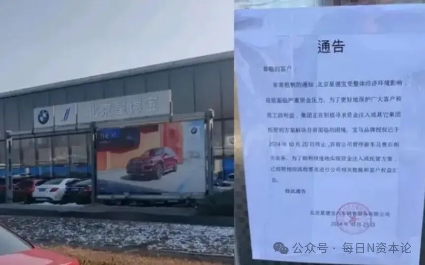 10月23日,北京星德宝汽车销售服务有限公司(下称,星德宝)门店张贴的一则通告显示:星德宝受整体经济环境影响,目前面临严重资金压力,集团正在积极寻求资金注入或其它集团托管的方案解决目前面临的困境。宝马品牌授权已于2024年10月20日终止,目前公司暂停新车及售后相关业务。