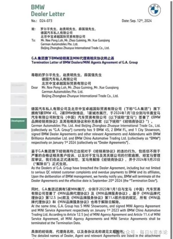 网传9月12日,宝马总部向罗尔平、赵贵明、薛国强三位自然人主体和德国汽车私人有限公司、北京中宝卓越国际贸易有限公司两家公司发出经销商代理协议终止函。函件显示,G.A.集团旗下经销商出现包括但不限于严重的合格证相关客户投诉、对宝马及关联公司付款逾期等违约行为。