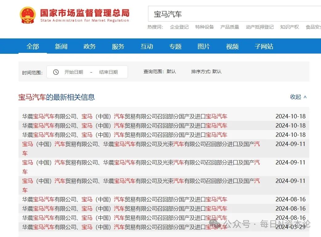 但不能回避的是,宝马近些年来或许是产能提高,其在质量问题上也逐渐多了起来。“每日资本论”在国家市场监督总局官网上搜索宝马汽车,发现仅2024年3月29日至2024年10月18日,宝马(中国)汽车贸易和华晨宝马,共计10次召回。