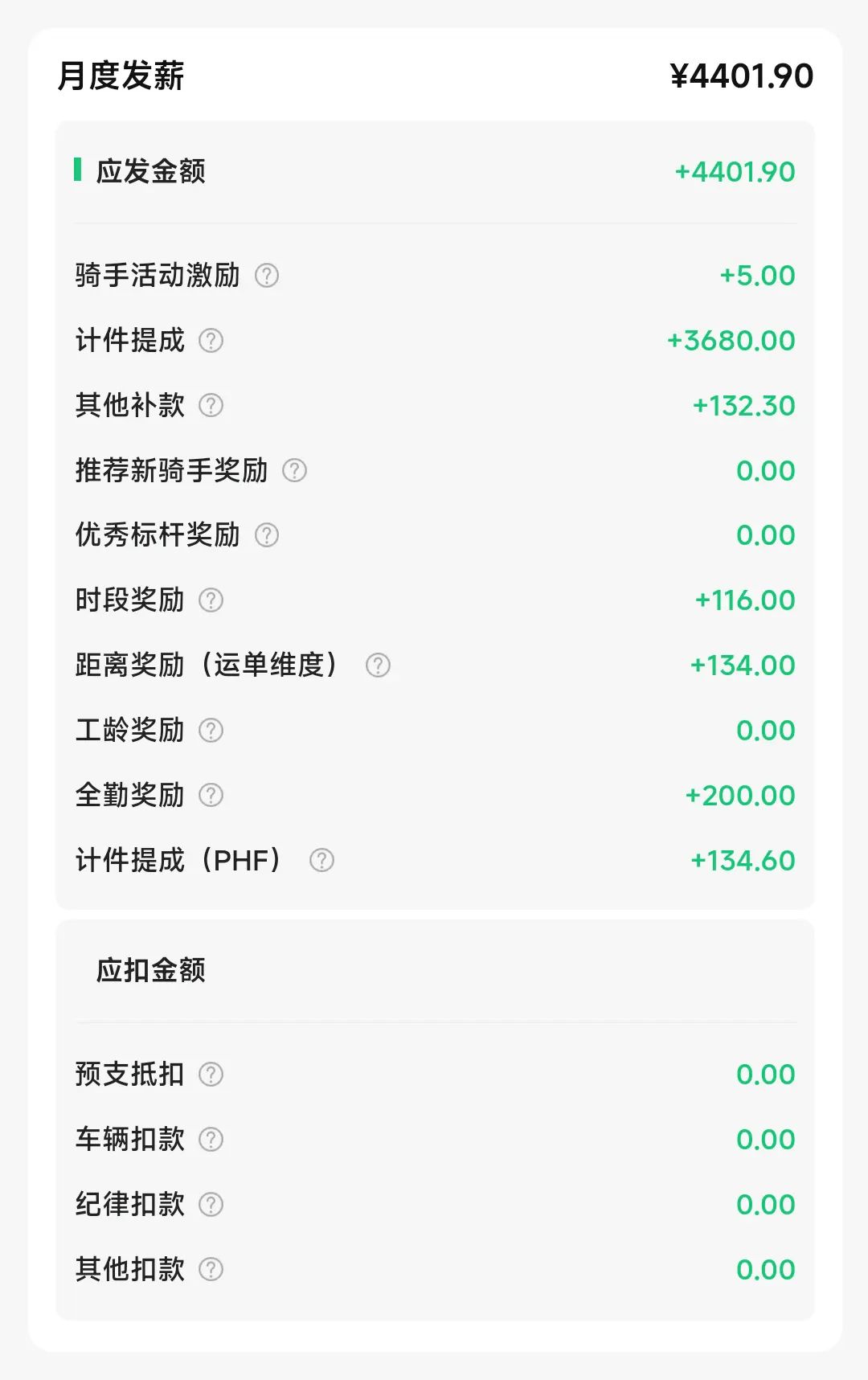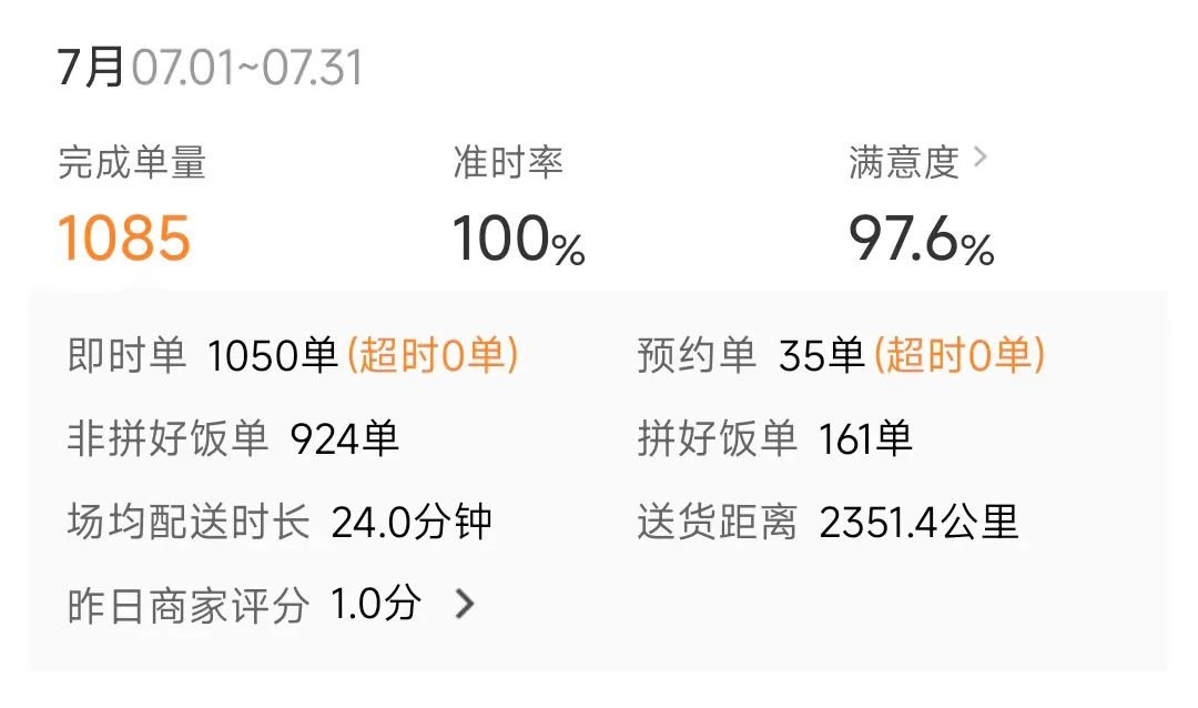 由于 6 月和 8 月只各干了半个月算兼职,每单价格算 3 块,并且没有各种补助,所以这里只说 7 月,其具体的单量和工资明细见下图,工资在小县城还是超过了其他的大部分暑假工的。
