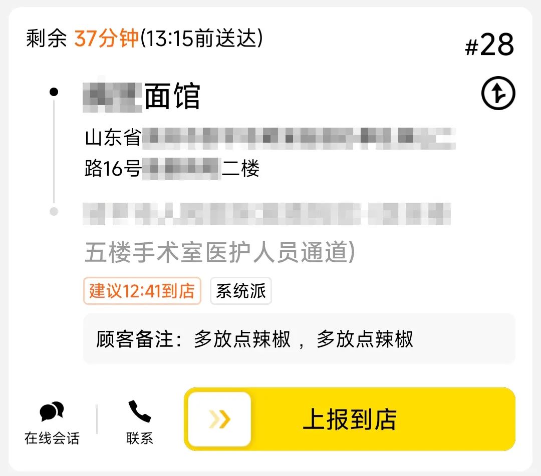 骑手每天上班时需要在 app 中刷脸上线,之后便等待系统派单,系统派单后会显示取餐商家,取餐号,送餐地址以及剩余时间。骑手需要在规定时间内送到,超出会罚款。