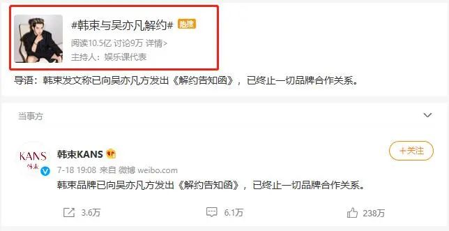 这条解约微博引发了巨量关注及转发评论,相关话题#韩束与吴亦凡解约#一度被推上微博热搜,相关话题阅读量超10亿。