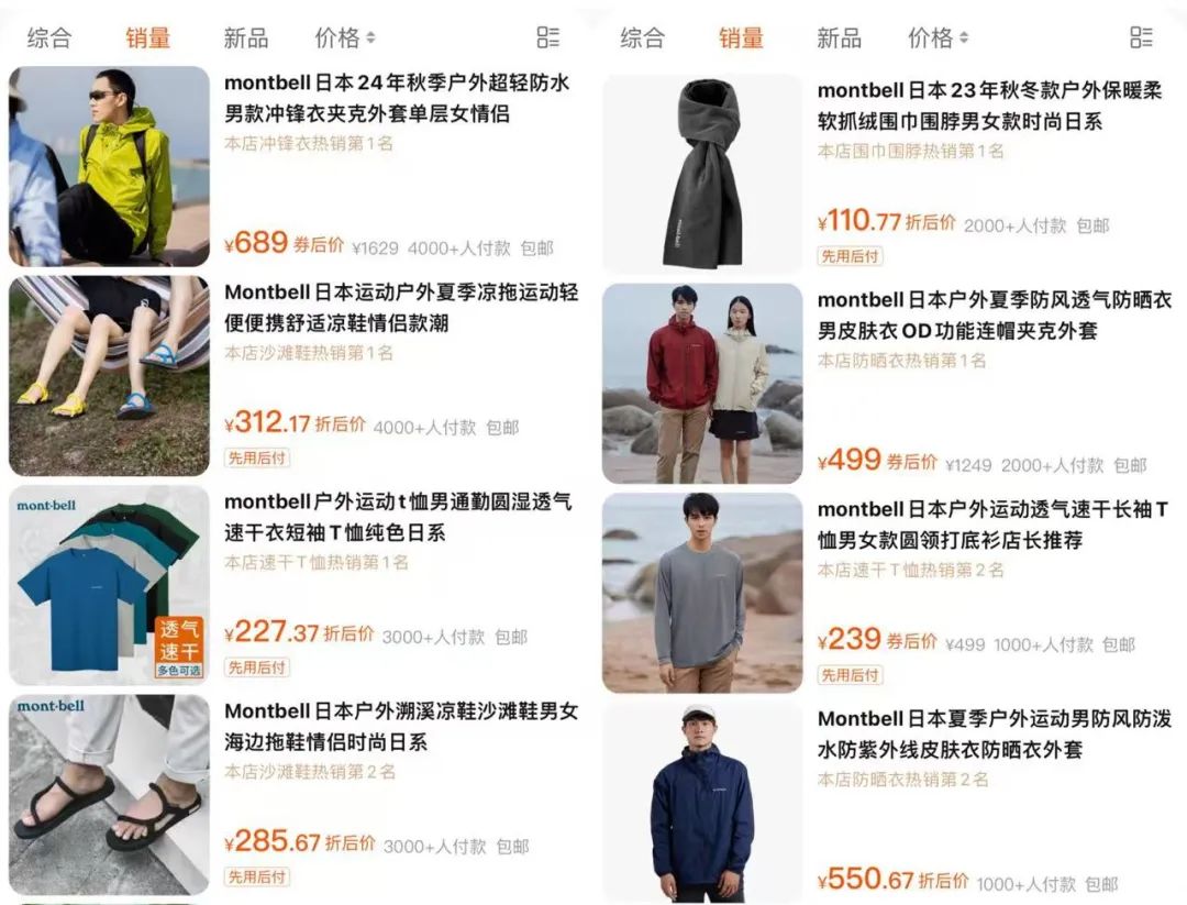 虽然中国市场定价不便宜,但就销量来看,天猫montbell旗舰店热销款冲锋衣、凉鞋、速干T恤的销量依然达到4000—5000件。