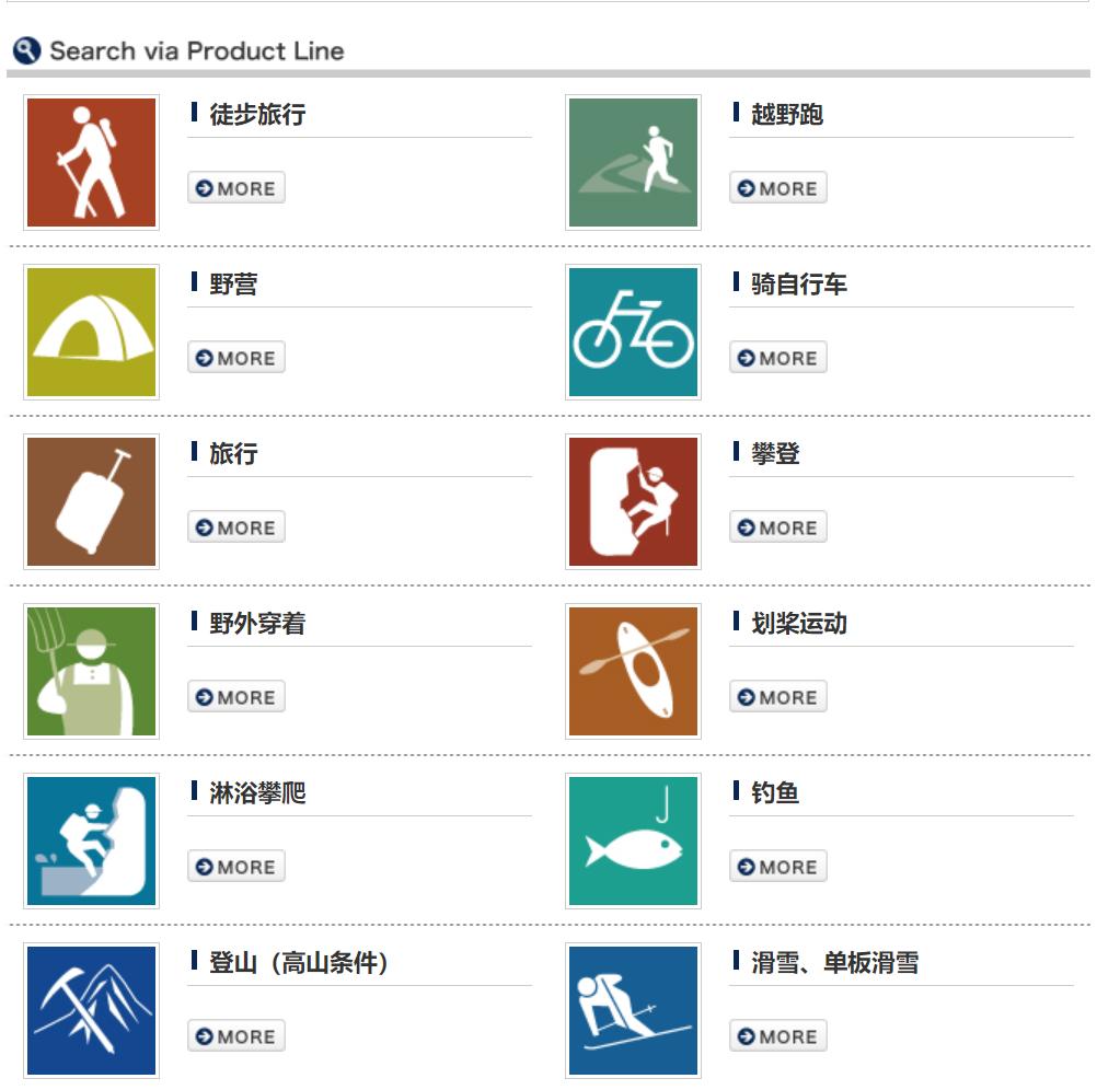 打开品牌官网,可以发现montbell的产品线非常丰富,覆盖徒步、跑步、露营、骑行、旅行、攀岩、游泳、登山、钓鱼、滑雪等大部分户外运动。