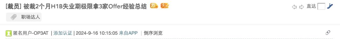 其中一些热门帖子,如「被裁 2 个月 H1B 失业期极限拿 3 家 Offer 经验总结」,其经验详实程度,让人不禁梦回高考/考研。