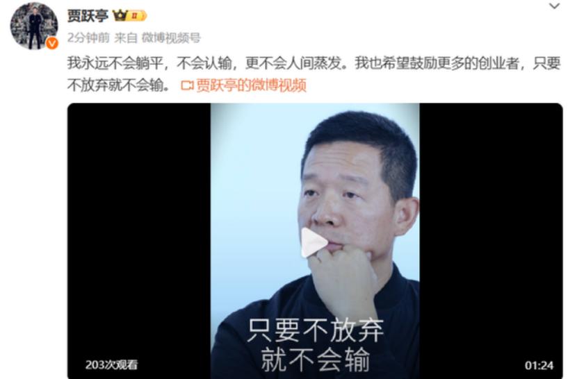 哪管天下众说纷纭,贾导师依旧我行我素。近日,贾跃亭发微博称:“我永远不会躺平,不会认输,更不会人间蒸发。我也希望鼓励更多的创业者,只要不放弃就不会输。”他还在视频中反复强调他不是骗子,要在两年内还清债务并回国。