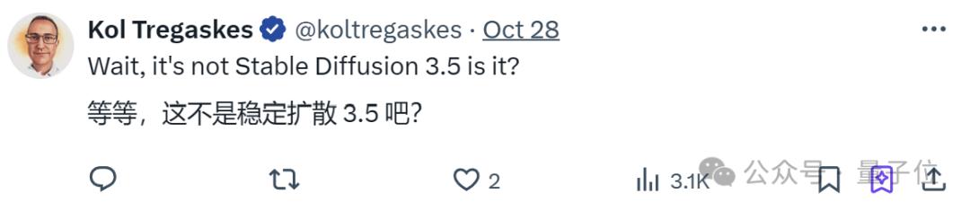 还有人猜测是中杯Stable Diffusion 3.5,这是Stability AI上周发布的模型型号之一,拥有25亿参数,采用改进的MMDiT-X架构和训练方法,能够生成分辨率在0.25~2百万像素之间的图像。