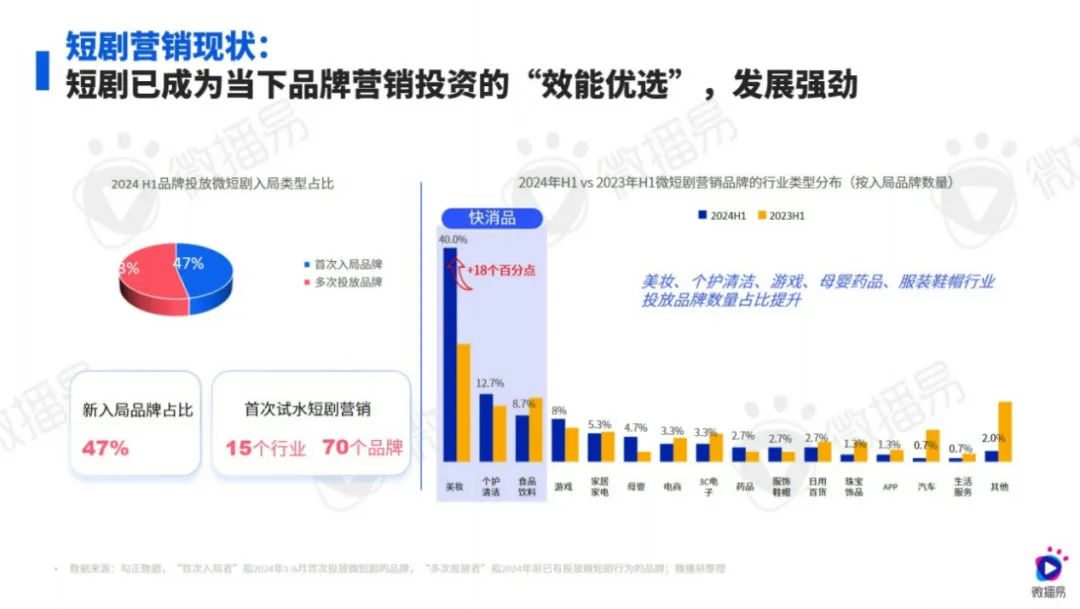 微播易《2024短剧整合营销指南》显示,今年上半年,有15个行业70个品牌开始试水投放微短剧,其中新品牌入局占比高达47%。