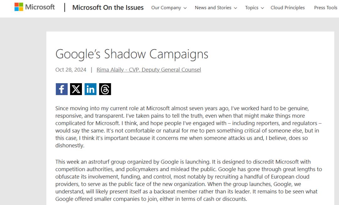近日,微软副总法律顾问 Rima Alaily 近日发表了一篇 1500 字的博客文章,指责谷歌多次试图通过竞争监管机构、政策制定者和误导公众来诋毁微软。