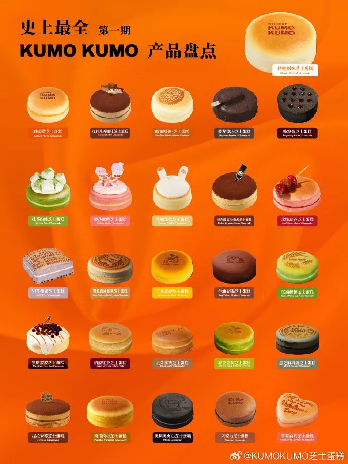 例如,kumokumo专注做芝士蛋糕,蛋糕品类涵盖巴斯克、半熟芝士、舒芙蕾蛋糕、拿破仑等不同形态,口味覆盖巧克力芝士、开心果芝士、提拉米苏芝士等不同口味,将芝士蛋糕玩出新花样。再如泽田本家,将铜锣烧的夹心物进行创意改造,制成300多种不同口味。