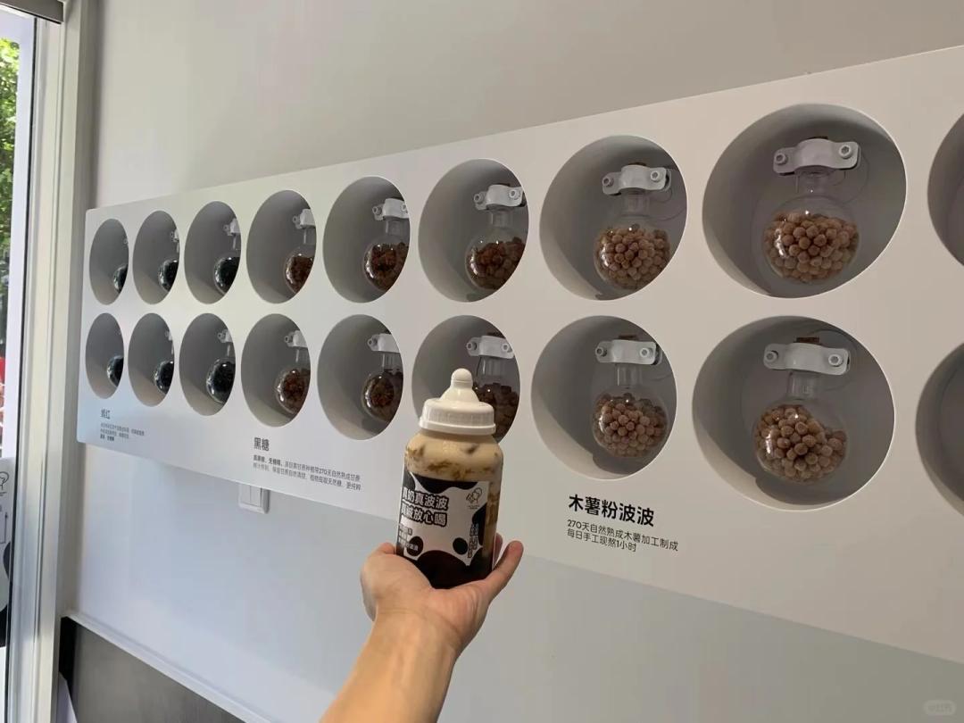 第三,原料公示,明档现制。喜茶波波站强调“手作”、“现制”、“鲜牛乳”,采用270天自然成熟的木薯制成波波,每日现熬一小时黑糖珍珠,还专门做了一个木薯原料展示墙;七分甜杨枝甘露专门店则在鲜果陈列区摆放制作杨枝甘露的椰子、芒果、西柚等原料,采用明档吧台在顾客面前现切现做,让消费者直观感受产品的制作流程。