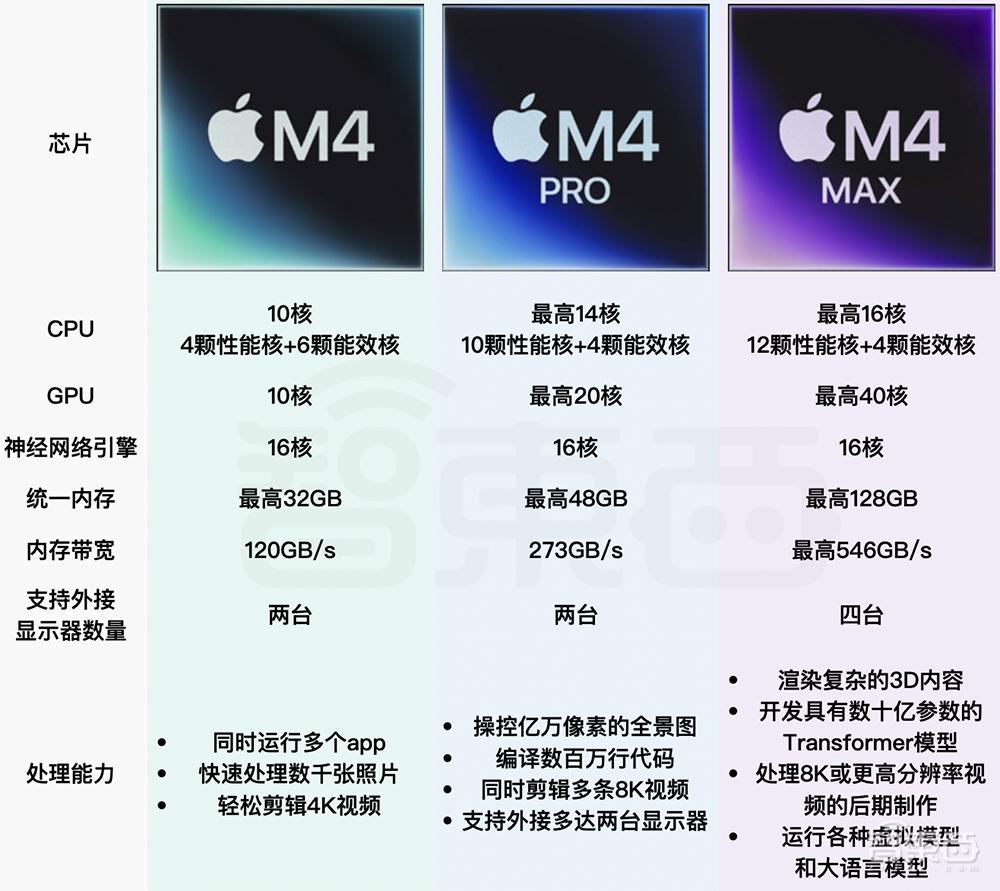 M4、M4 Pro与M4 Max对比(智东西制表)
