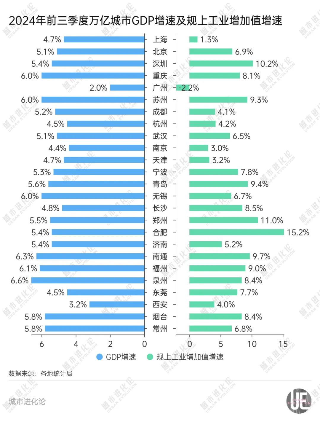 截至目前,全国26座万亿城市除佛山外,均已公布前三季度经济数据。其中,合肥GDP达到 9697.1亿元,同比增长5.4%,高于全国0.6个百分点;规上工业增加值增速更达到15.2%,高出全国9.4个百分点,领跑万亿城市。