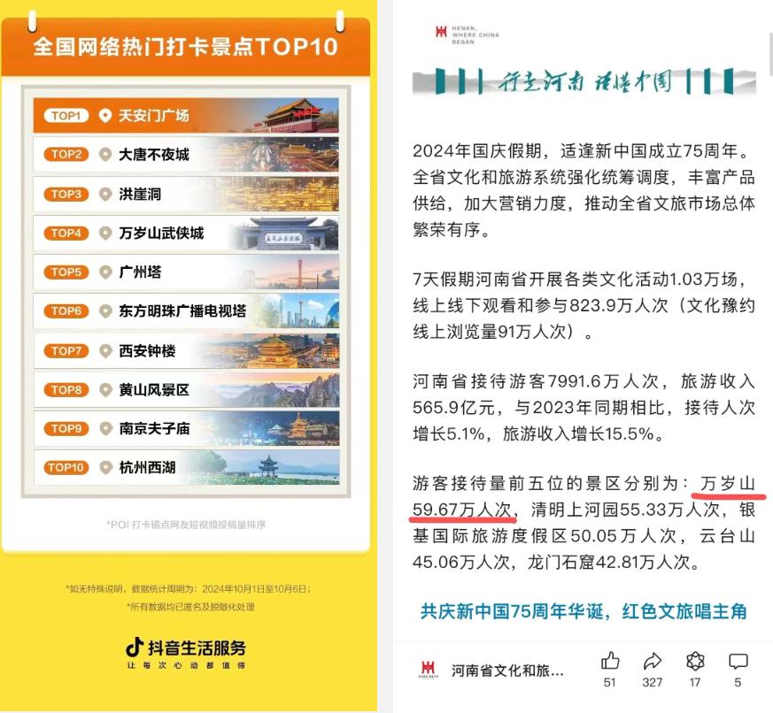 今年国庆,万岁山武侠城景区一度启动限流措施,暂停线上购票,成为河南省接待游客量最高的景区,将清明上河园、银基国际度假区、云台山、龙门石窟等知名景区甩在身后,登上抖音全国网络热门打卡景点TOP10第一名。