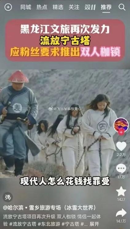 去年网络社交平台推动了哈尔滨的火爆冬天,深谙此道的黑龙江镜泊湖景区近期又沿着古人流放路线设计了“流放宁古塔”旅游项目。