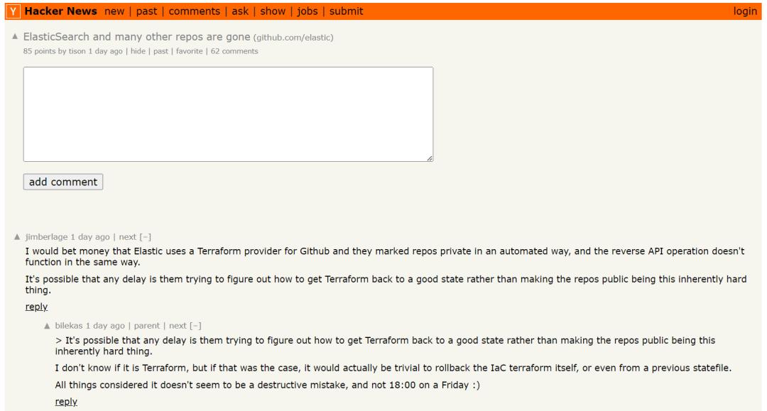 对于此次事故更详细的原因,有网友猜测,Elastic 使用的是针对 GitHub 的 Terraform 提供程序,并且他们以自动化的方式将仓库标记为私有,而反向 API 操作则无法以相同方式执行。