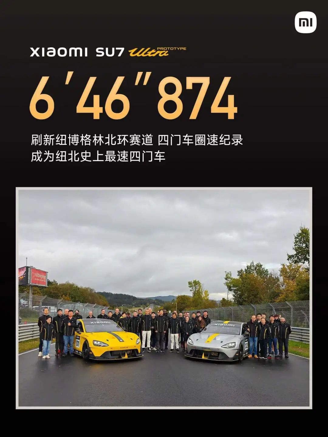 10月29日,凭借总马力高达1548PS的双V8s加V6s三电机系统(其中V8s为小米完全自研),小米SU7 Ultra原型车在纽伯格林北环赛道首秀中,以6分46秒874的官方认证圈速成绩,成为全球最速四门车。