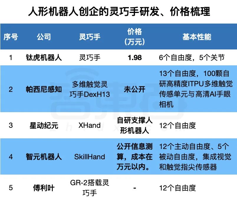 ▲人形机器人创企灵巧手研发、价格梳理(整理自公开信息,智东西制表)