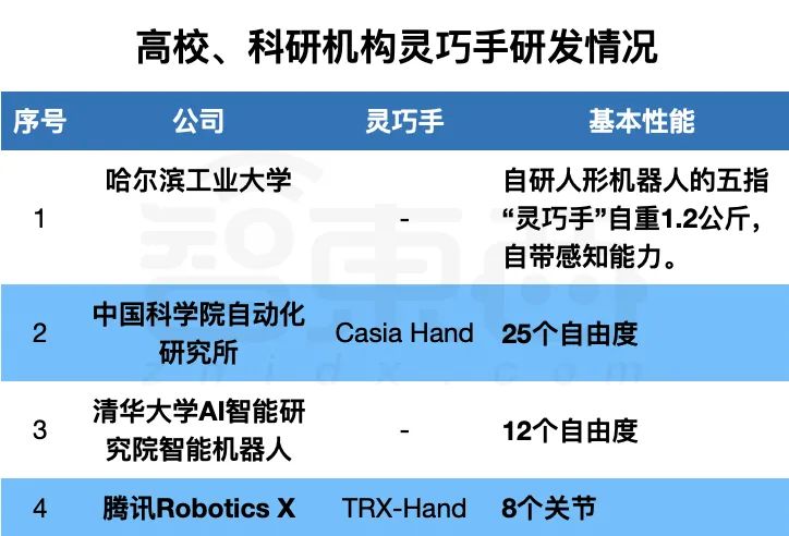 ▲高校、科研机构灵巧手研发情况(整理自公开信息,智东西制表)