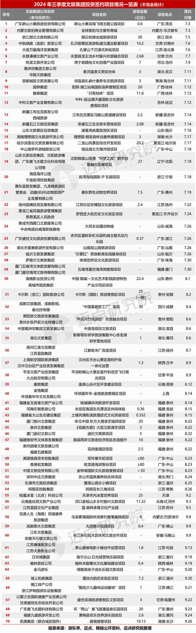 签约项目分布情况,以广东、福建、江苏3省相对集中,三者合计占比四成。可见,商贸经济繁荣、旅游发展基础雄厚的省份依然为文旅投资的热门区域。2024年,广东省文旅发展加速,锚定万亿级文旅产业目标,不断推进重点项目建设,夯实文旅产业融合发展基底,Q3以中山、惠州、佛山、珠海、茂名、湛江等为代表,均有文旅项目签约落地。