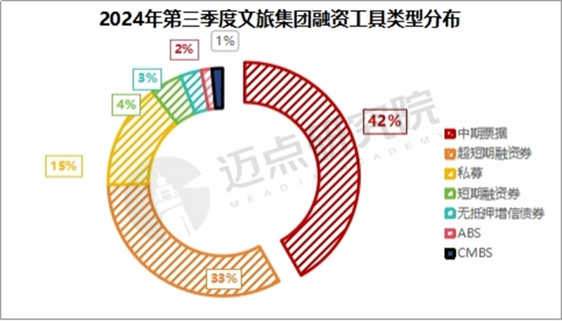 三季度各文旅集团融资以债务融资为主导(仅有两项债权融资),融资工具以中期票据为主,占比42%;其次为超短期融资券和私募,占比分别为33%、15%。而短期融资券、ABS、CMBS、无抵押债券,占比则较低,但对拓展融资渠道、创新融资方式等具有重要意义。