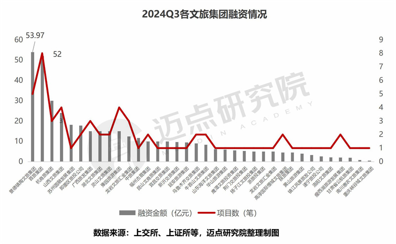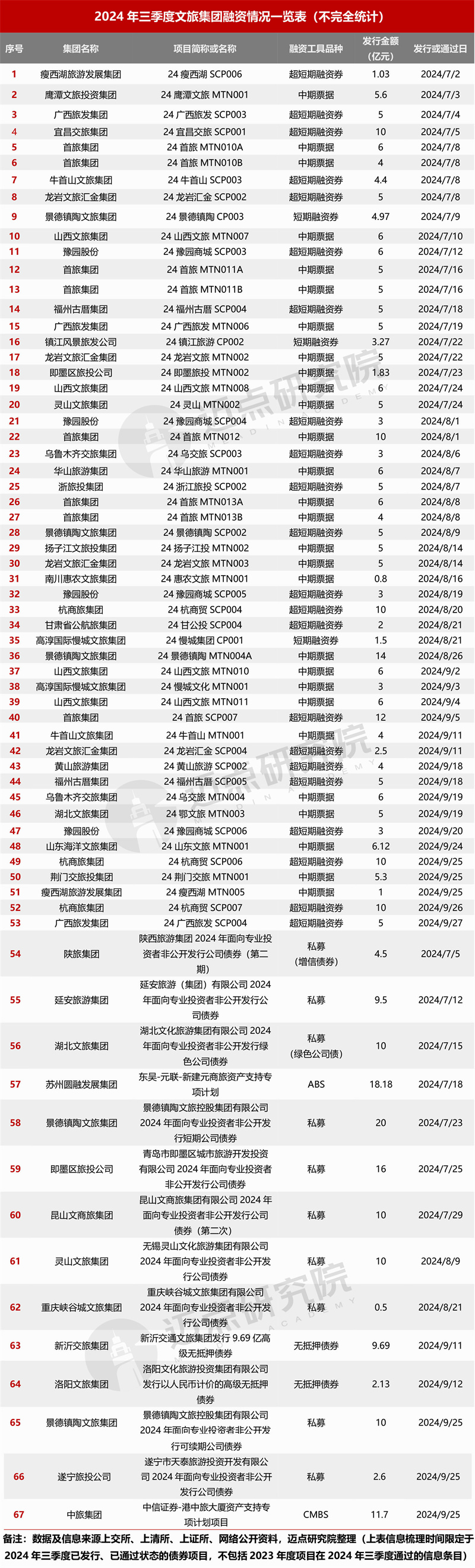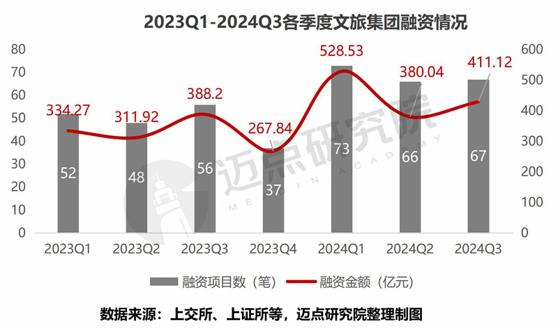 据迈点研究院不完全统计,2024年三季度文旅集团融资项目(仅指已发行和通过)67项,涉及36家文旅集团,融资金额总计411.12亿元,同比增长约10%。环比方面,项目数量与Q2基本持平,金额略有增长。