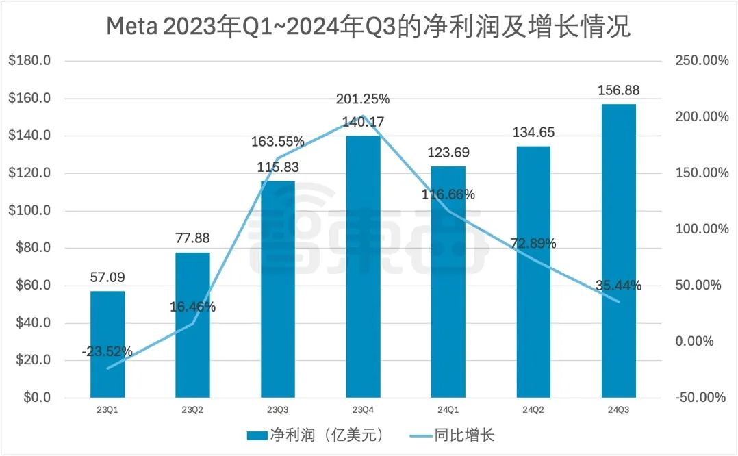 ▲Meta 2023年Q1~2024年Q3的净利润及增长情况