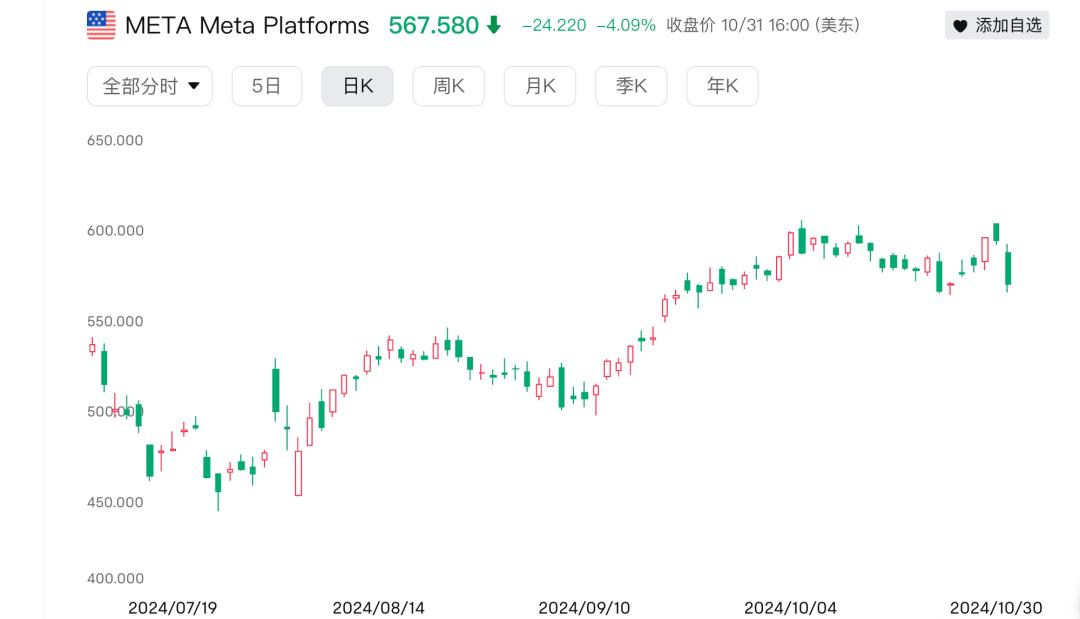 财报公布后,Meta股价盘后一度跌逾3%,后收窄至3%以内。截至撰稿,Meta股价为567.58美元,较昨日收盘下降4.09%,市值1.44万亿美元。