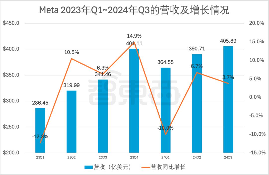 ▲Meta 2023年Q1~2024年Q3的营收及增长情况