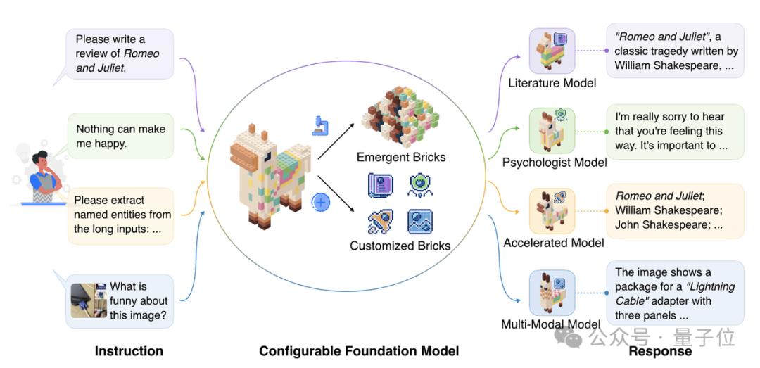 如下图所示,大模型看做是一个大的积木,将其按照功能拆分成一个一个小模块之后,给定一个指令时,我们仅需选用部分相关的模块组成子模型即可完成任务。